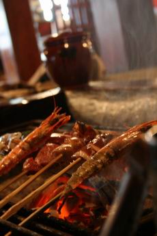 囲炉裏の縁に醤油ベースのたれが入っているので これに浸けて2度焼きします。