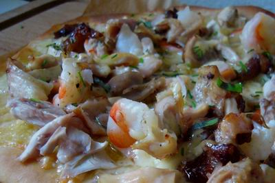 2枚目は鶏のスモーク、エビ、シャンピニオンのマヨネーズピザ。