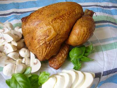 鶏を丸ごと1匹、ブナの木で燻したもの。