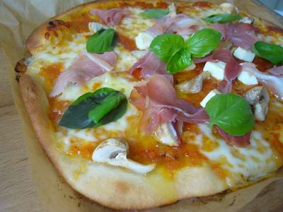 Sur la pizza,j'ai mit la mozzarella,les champignons,la feta,du basilic,et du jambon cru.
