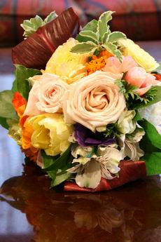 左)バラをとても気に入ってくださって、開いた姿を見るのが楽しみだと何度もおっしゃってくださいました。葉っぱを大きく大胆に組み込んだブーケは存在感、ボリュームがあり個性が際立っています。