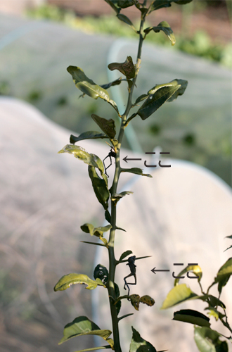 発見したときは「きゃ~っ!」と言いましたよ。喜びの悲鳴ですけど(笑)それにしても発見当時は沢山付いていたんです。全ての棘に刺さっているくらい、数十匹。