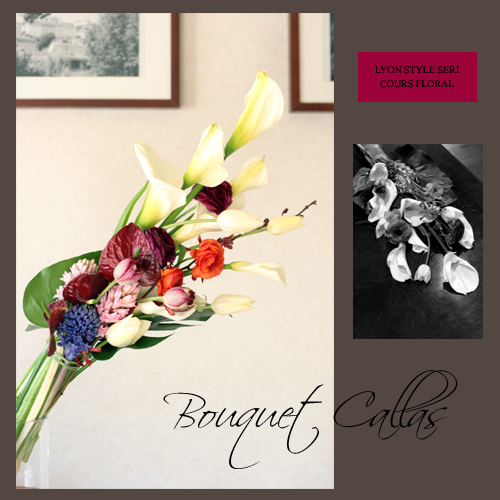 今日は今年初入荷の白いカラーと、香りだけでも春を感じることの出来るヒヤシンスをあわせて ずっしり重~いブーケを束ねました。