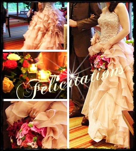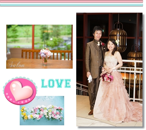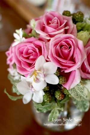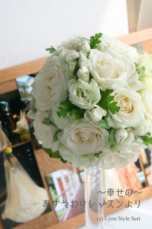 生成りのドレスになじむバラを選びました。