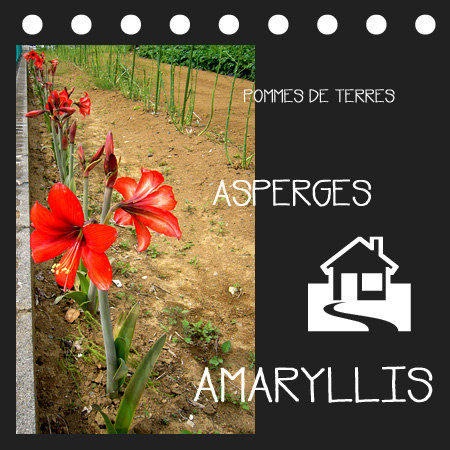 アマリリスの横にはアスパラ、さらに奥にはジャガイモが育っています。