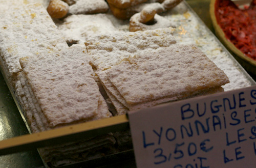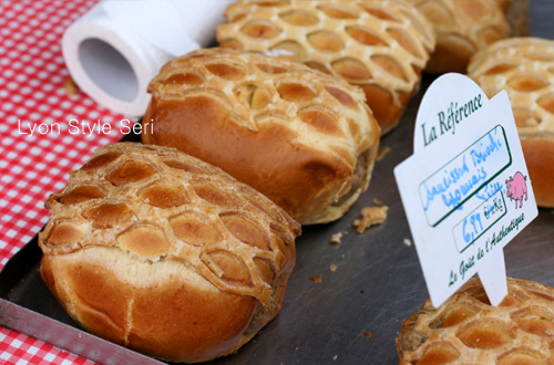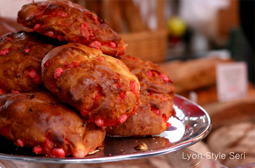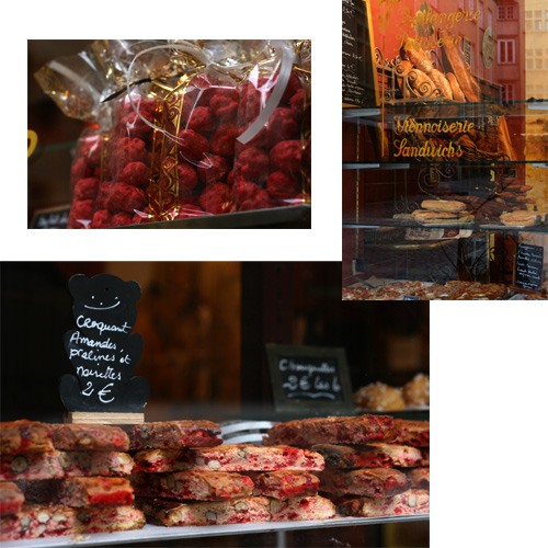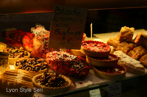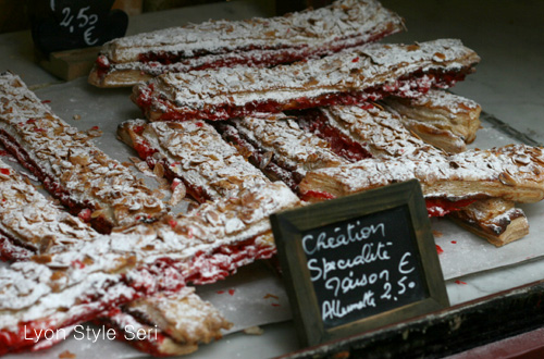 リヨンでは赤いプラリネを使ったお菓子が沢山並びます。