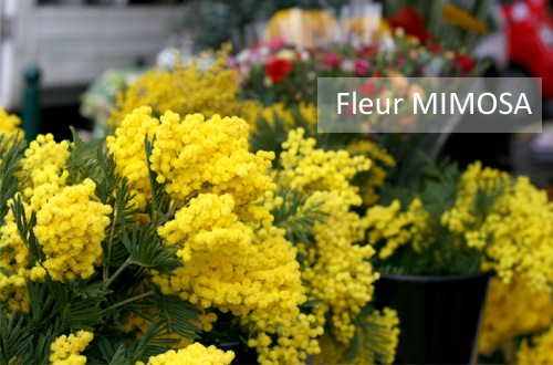 マルシェにいくと、バケツからあふれ出したようてんこ盛りのミモザがキラキラ輝いています。