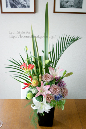 モンステラの葉を添えてダイナミックに生けていきます。
