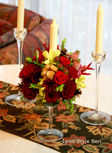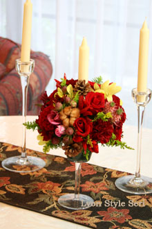 クリスマスのテーブルを華やかに演出するキャンドルアレンジメント。