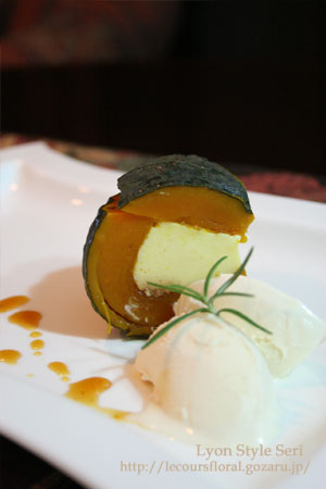 種をくり抜いたかぼちゃにキャラメルソース、プリン生地を流して蒸したのだそうです。