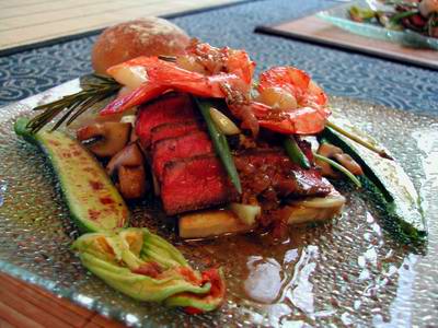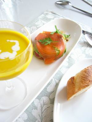 前菜には家庭菜園で採れた完熟ミニトマトとアボカドをレモンの利いたドレッシングで和え、サーモンを敷いたセルクル型に詰めました。