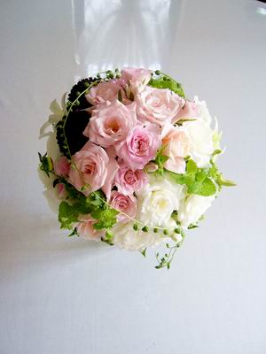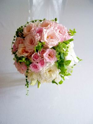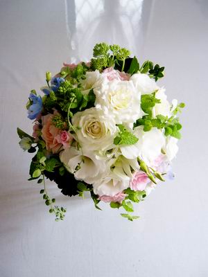 この暑さに対抗して、今日はフレッシュグリーンと白、淡いピンクを使ったブーケです。