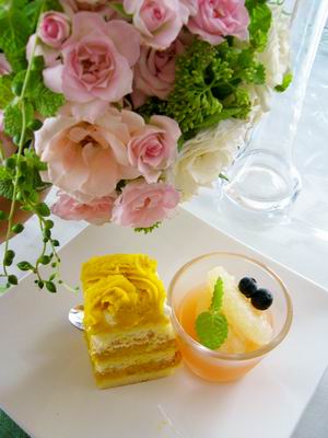 本日のデザートはカボチャのショートケーキ、冷た~いグレープフルーツのジュレ。