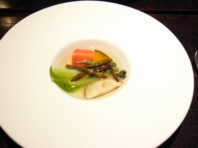 ・目鯛のソテーふきのとうのフリット、ハバノリ添え