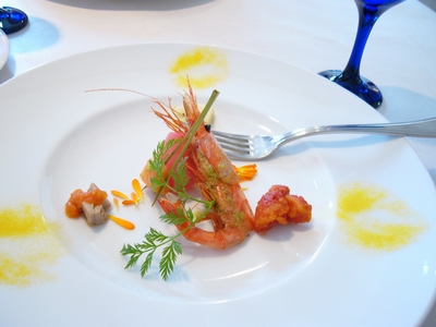 前菜は有頭エビのカラ揚げ、スモークサーモン、カブのピクルス。
