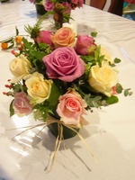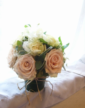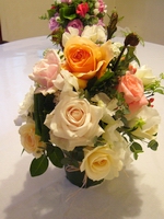 白、淡いピンク、クリームオレンジのグラデーションが楽しめる作品です。大輪のバラと、中輪のバラとのバランスが難しいお花でしたが、綺麗に仕上がりました。