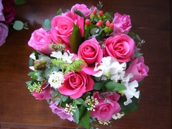基本になるバラが綺麗に入ったので、仕上がりも綺麗にまとまっています。ふくらみの欲しい辺りに、長めに挿したゼンマイ、効果◎です。
