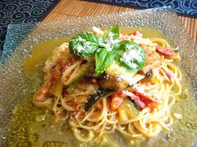 今日はあり合せの野菜、ズッキーニ、マッシュルームとラルドンを加えて 仕上げにたっぷりパルメザンチーズをかけました。
