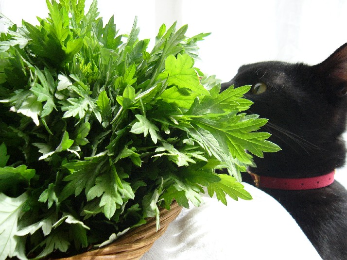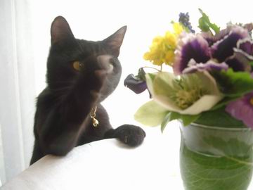朝起きると花が食いちぎられていたり、花瓶が倒れていたり・・なんてことがあります。これは猫のPitchaの仕業。私の実家には黒猫が2匹。まだ10ヶ月のやんちゃ盛りです。Pitchaは生野菜もかじります。特に菜っ葉がお気に入り。変な子♪